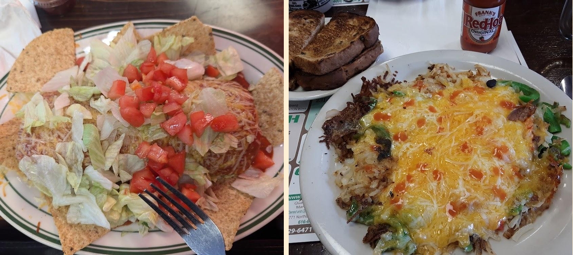 Don't miss the Texas Hash and Biscuits & Gravy. For lunch, the Hand Battered Onion Rings and any of the baskets are delicious. A perfect finish is their desserts, which are excellent.